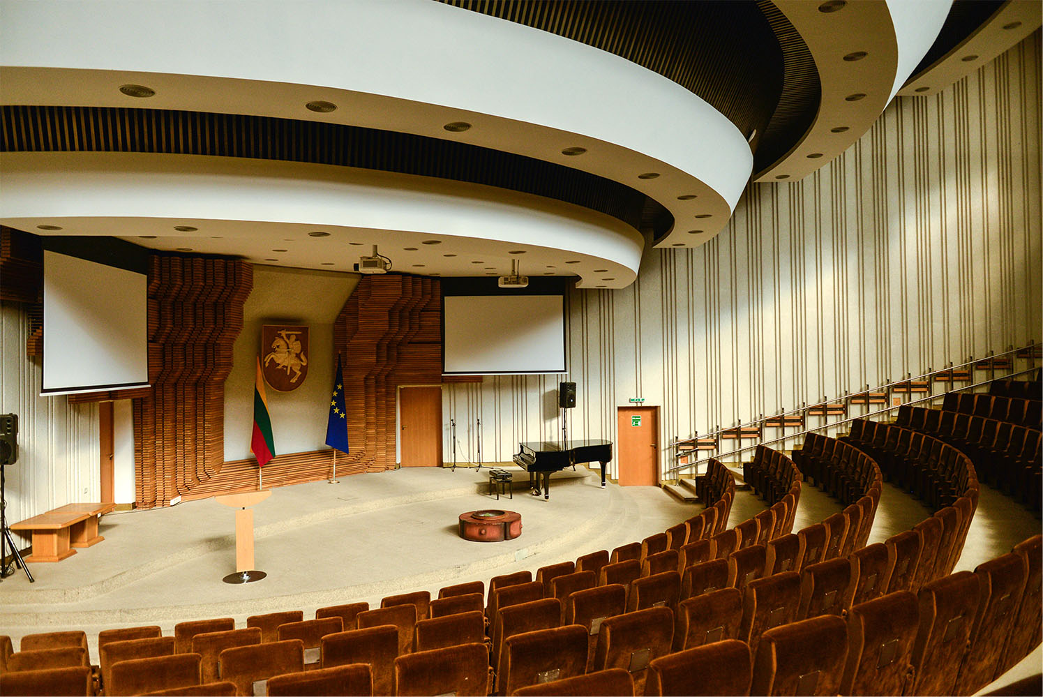 Daugiau nei prieš tris dešimtmečius pastatyto komplekso išlikę interjerai – autentiški, atspindintys tuo metu vyravusią stilistiką su jiems pritaikytais unikaliais meno kūriniais, kuriuose iki šiol posėdžiauja svarbiausi politikos asmenys.