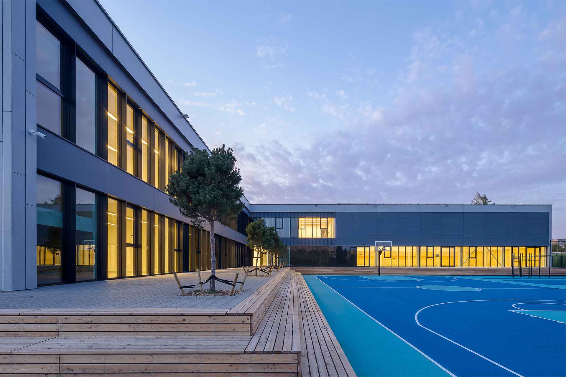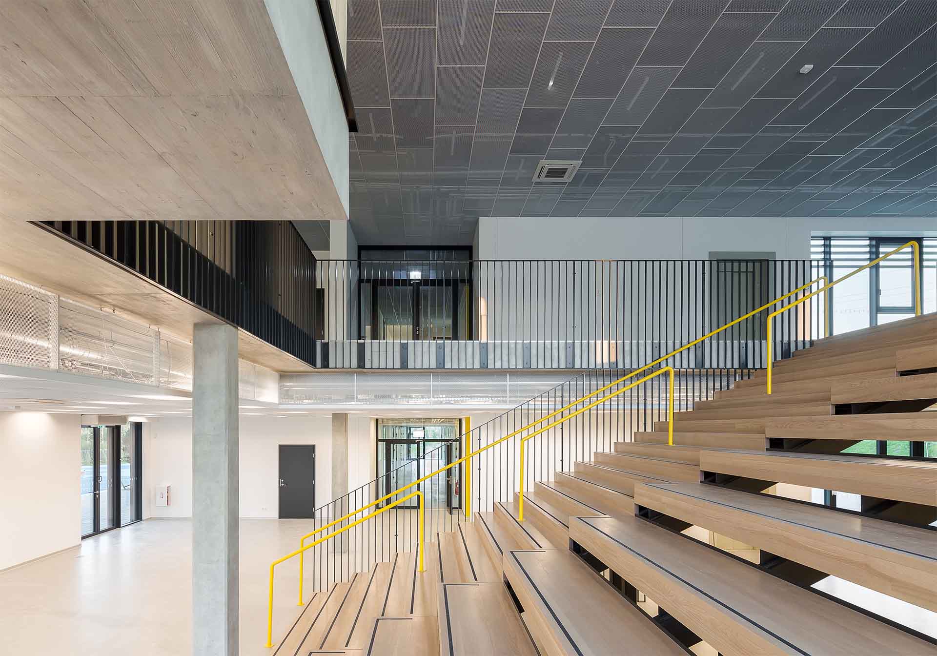Neutrali ir lakoniška pastato išorės architektūra veikia kaip fonas būsimai Šv. Jono Pauliaus II bažnyčiai ir apgaulingai slepia dinamiškas erdves esančias viduje. Vidaus erdvės yra kintančios – jas galima apjungti arba suskaidyti, kadangi daugelis pastato sienų yra stumdomos. Dėl to mokyklos vidinė struktūra lengvai prisitaiko prie funkcinių pokyčių bei žmonių poreikių ir gali talpinti įvairias veiklas, tapdama multifunkciniu centru, kuriame persipina veiklos, žmonės ir edukacija.