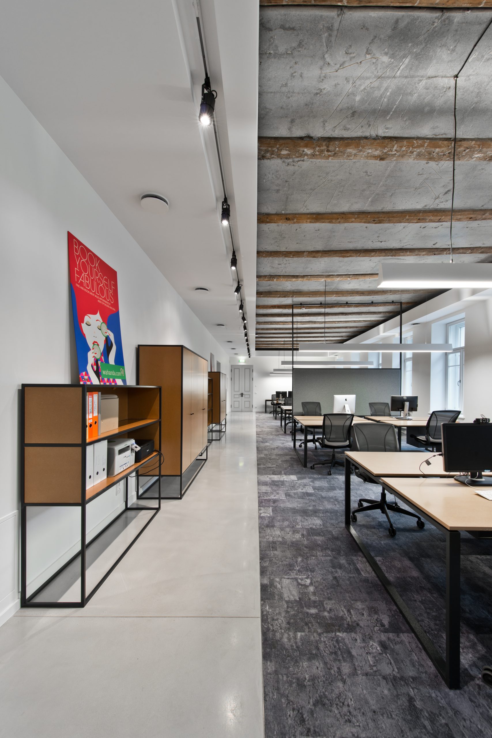 Interjere dominuoja atvira darbo zona, akcentuojamos natūralios medžiagos ir šviesūs atspalviai. Vienu iš pagrindinių šio biuro akcentų tapo eksponuojamos naujo betono perdangos įrengtos tarp išlikusių medinių sijų.