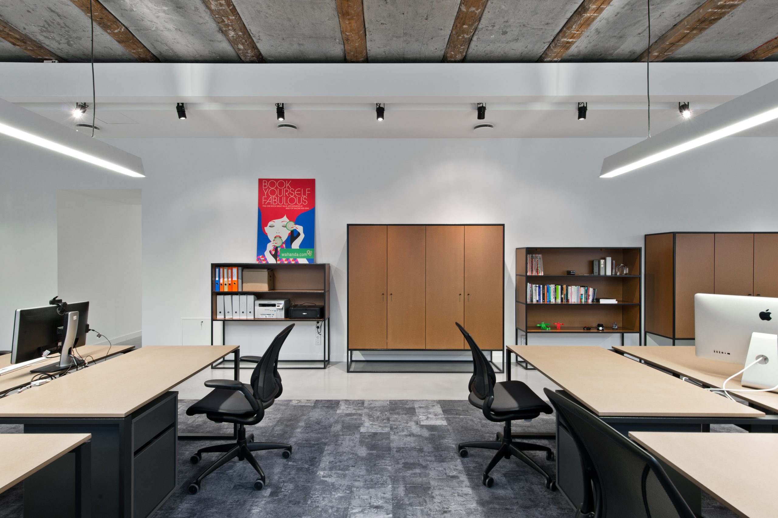 Didžioji dalis baldų nestandartiniai, specialiai suprojektuoti ir pagaminti šiam biurui, kurių pagrindinės medžiagos – dažytas metalas ir lakuota medžio dulkių plokštė.