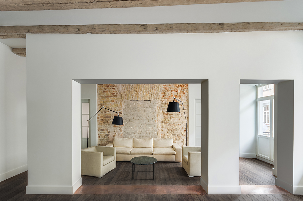 The size of the apartment is intriguing, and as you move through the space, noticing subtle details, the history-rich spaces reveal themselves from new perspectives and interesting angles. Life is bustling in the heart of the apartment – a designed kitchen with a large dining-billiards table and an adjacent living room. An exposed brick wall frames the space and marks the beginning of the private part of the house, the bedroom, and the office. The designed furniture seems to blend into the overall compositional whole and creates a unified harmony with the past and present.