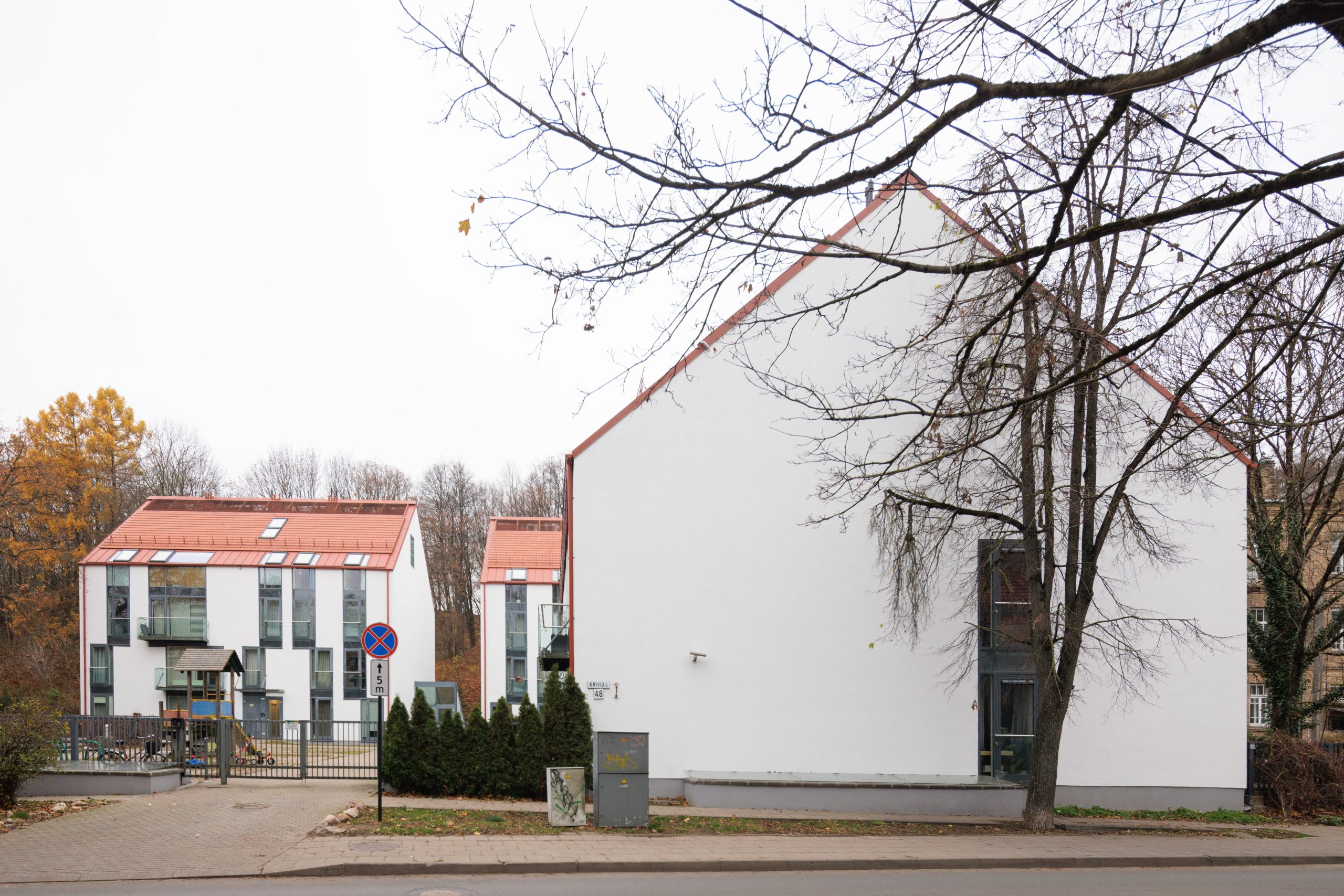 In the Užupis Republic, surrounded by the greenery of Kalnų Park, the “Krivių namai” (Krivių Houses) have been built. This is a complex of eight modern and contemporary houses consisting of three-story brick houses with attics and underground garages. The buildings have optimally sized and rationally planned apartments with outdoor terraces.