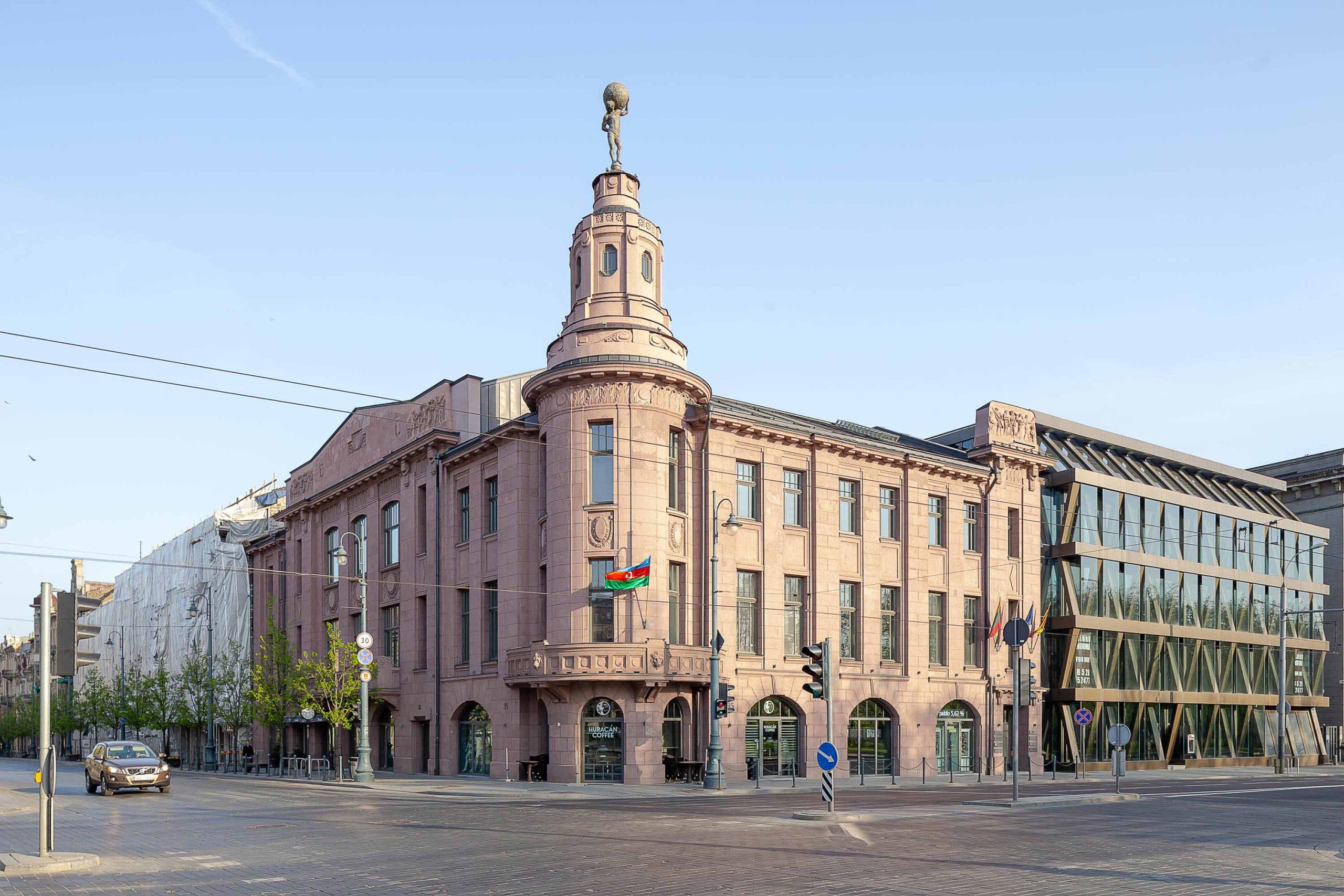 The building now consists of two parts: the historic old building and the new one designed by architect Alfredas Trimonis. The restoration of the building aimed to restore and preserve as many elements of the past as possible, making it possible today to rediscover forgotten architecture and to admire the most precious exterior and interior elements, shapes, colours, and the richness of decoration and ornamentation. The Baroque-style cylindrical tower, erected almost a hundred years ago, is crowned by a 3-meter high allegorical sculpture of Atlas – the building’s distinctive highlight at the corner of Lukiškės Square.