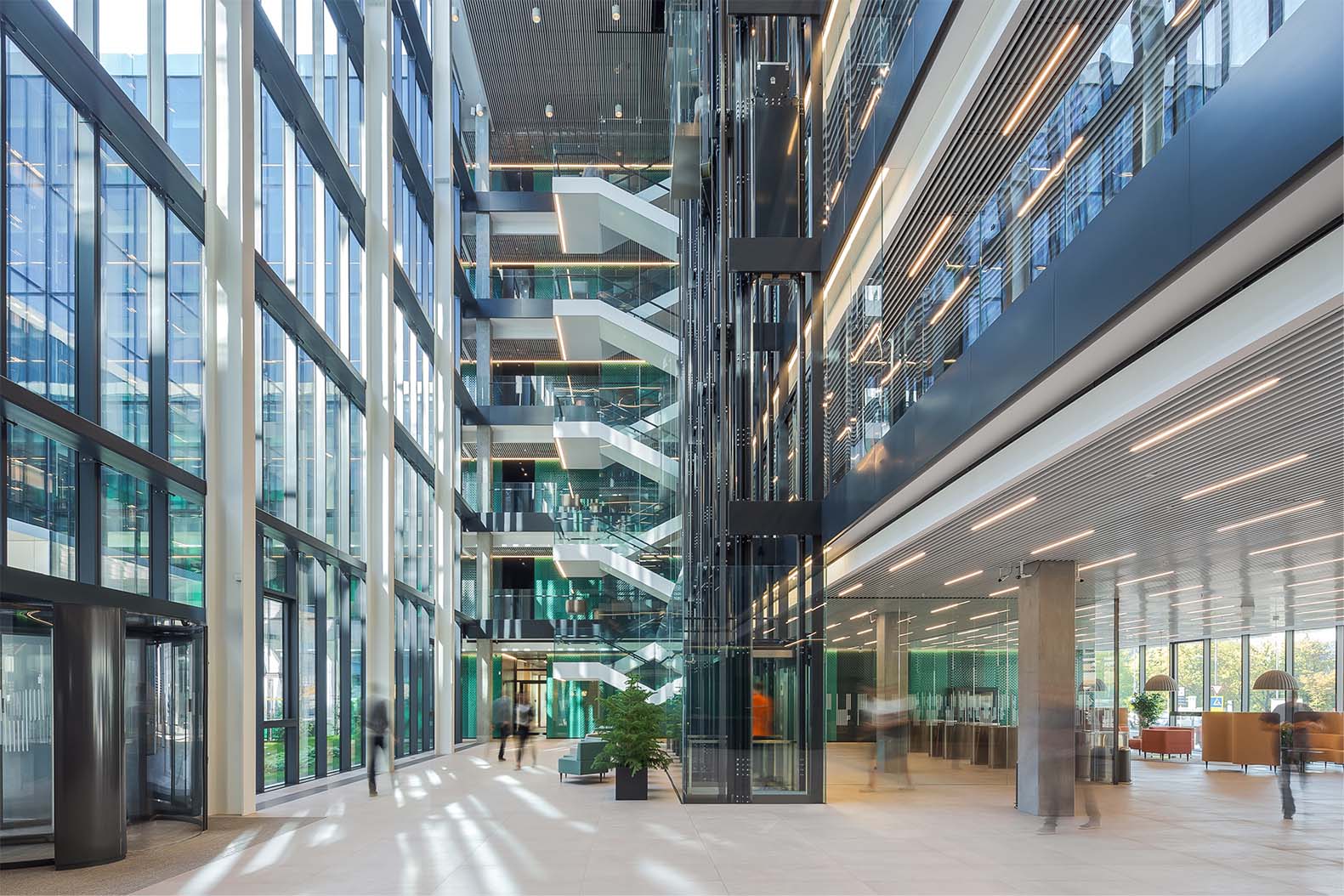 The architectural style of the business district is unified and does not compete with the surrounding environment, but blends into its urban context. The buildings of the complex themselves form a courtyard in the inner space, creating connections between the buildings. Each building reflects different natural themes in the interior: forest, water, meadow and valley. The aim was to make these buildings a cosy place to work at and be together, like a natural sanctuary where people meet unexpectedly and share their ideas – just like in the well-known Silicon Valley.