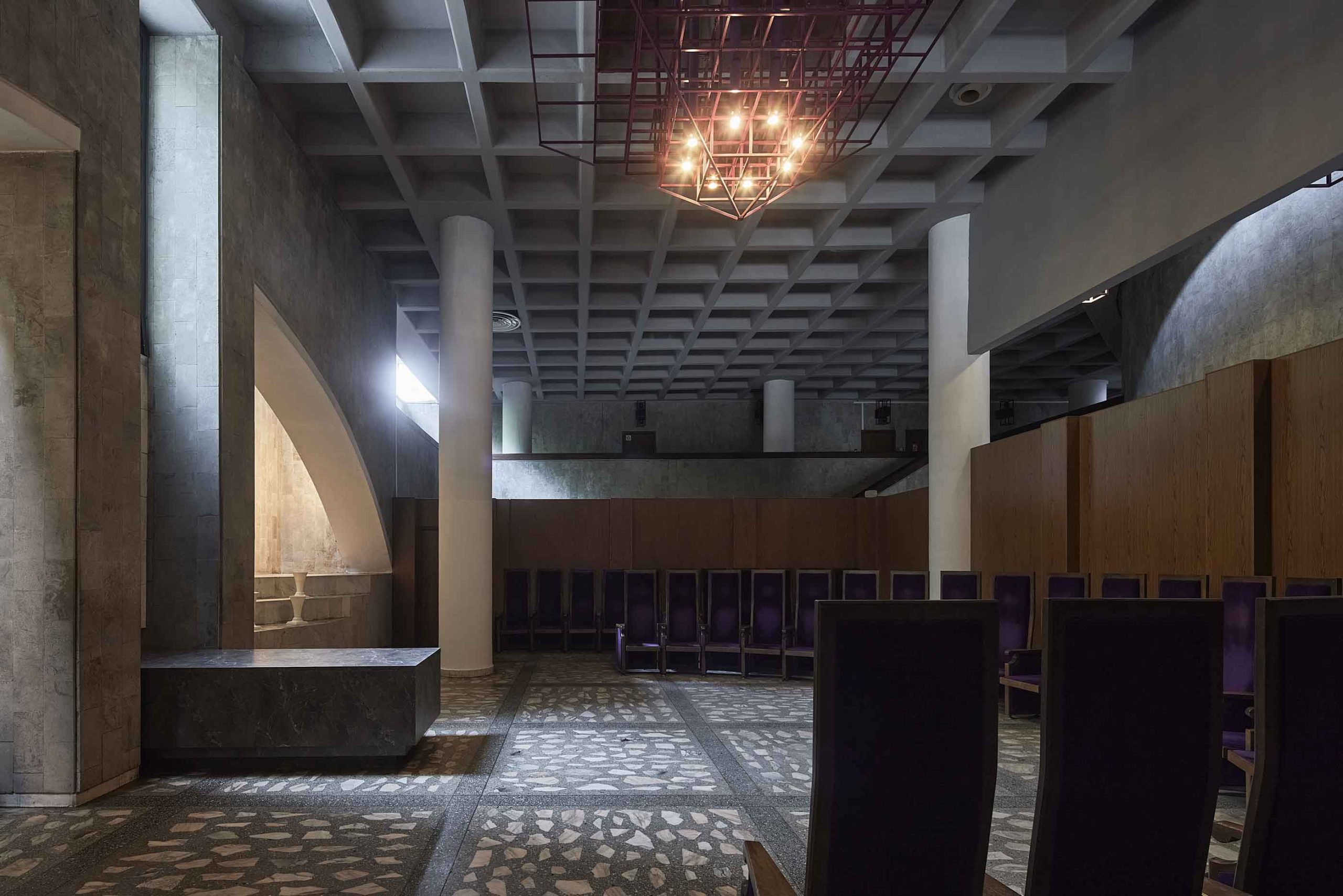 The main funeral hall is adorned with a five-part sgrafitto-fresco Milky Way by artist Nijolė Vilutytė, rising upward in a fragmented, fan-like composition. This space has hosted the farewells of many prominent figures in Lithuanian politics, culture, and the arts.