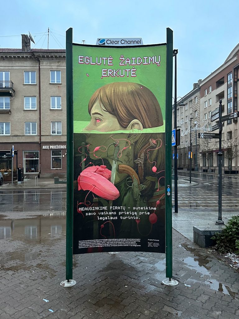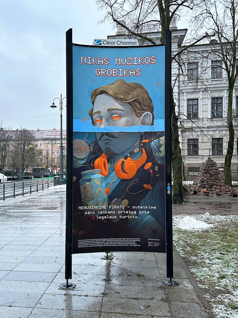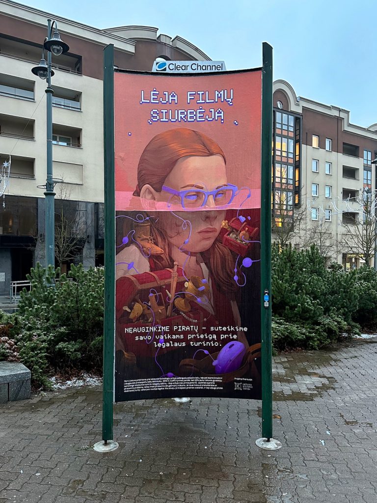 Kitas, dar visai šviežias projektas yra socialinė akcija „Neauginkime piratų“, kuriai su Stefanija Jokšyte sukūrėmė plakatų seriją. Šis projektas man svarbus ne tik dėl idėjos, bet ir dėl to, kad pirmą kartą reklamos stenduose pasirodė pilnai mano kurta iliustracija ir dizainas.